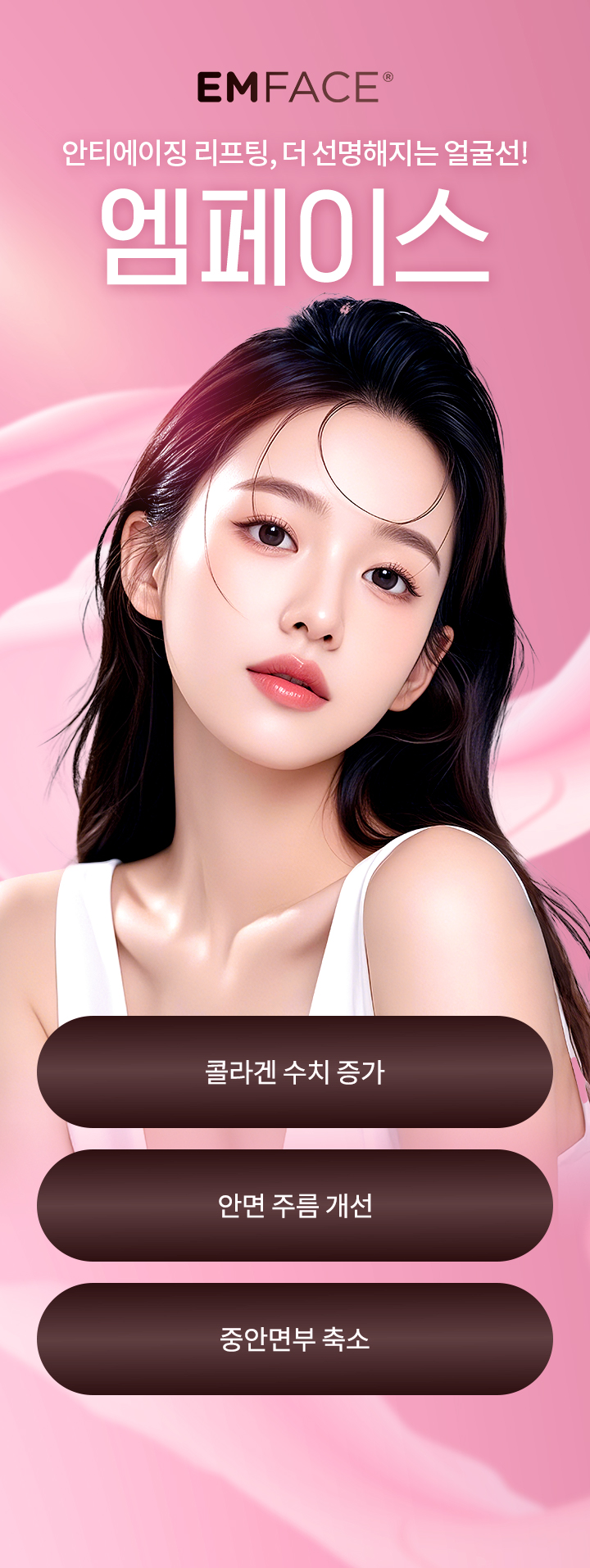 엠페이스는 처지고 늘어진 피부 탄력을 끌어올리고 표정을 만드는 피부 속 근육까지 리프팅하여 탄탄하게 끌어올려 주기 때문에 전체적인 얼굴 밸런스를 맞추면서 탄력 개선 효과를 기대할 수 있습니다.