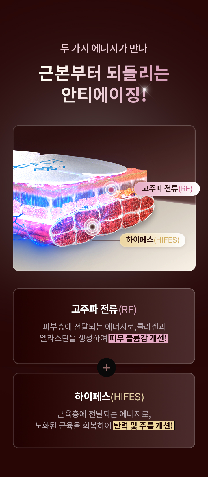 엠페이스(EMFACE)는 진피를 타깃으로 하는 고주파(RF)와 근육층에 작용하는 하이페스(HIFES)를동시에 조사해